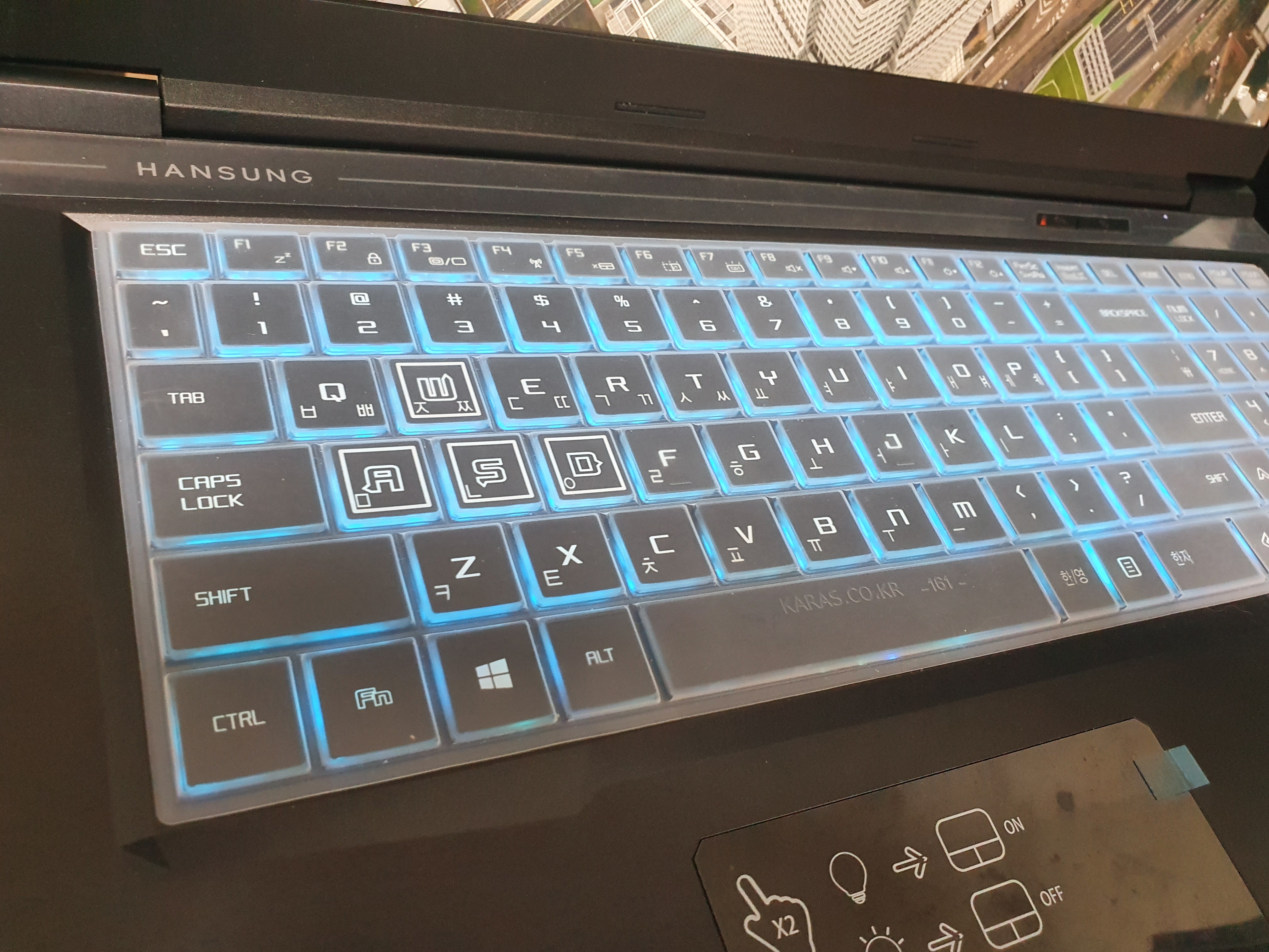 게임용 노트북이여서 인지 옛날 피씨방 색감이 느껴지는 조명달린 키보드가 인상적이다.